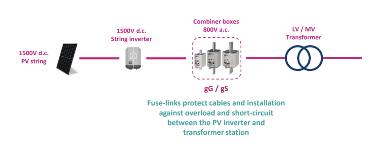 The main purpose of the protection on a.c. side is the protection of cables and installations between PV smart string inverter and the transformer station. Fuse-links have to be designed for uninterruptible operation in case of short-time overloads which could become a consequence of higher temperatures and the peak of power generation.